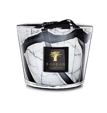 The scented candle is set in a hand blown glass replicating grey marble with black strokes edged with beige. The elegance of the glass reveals the flame, giving an effect of a luminous stone.