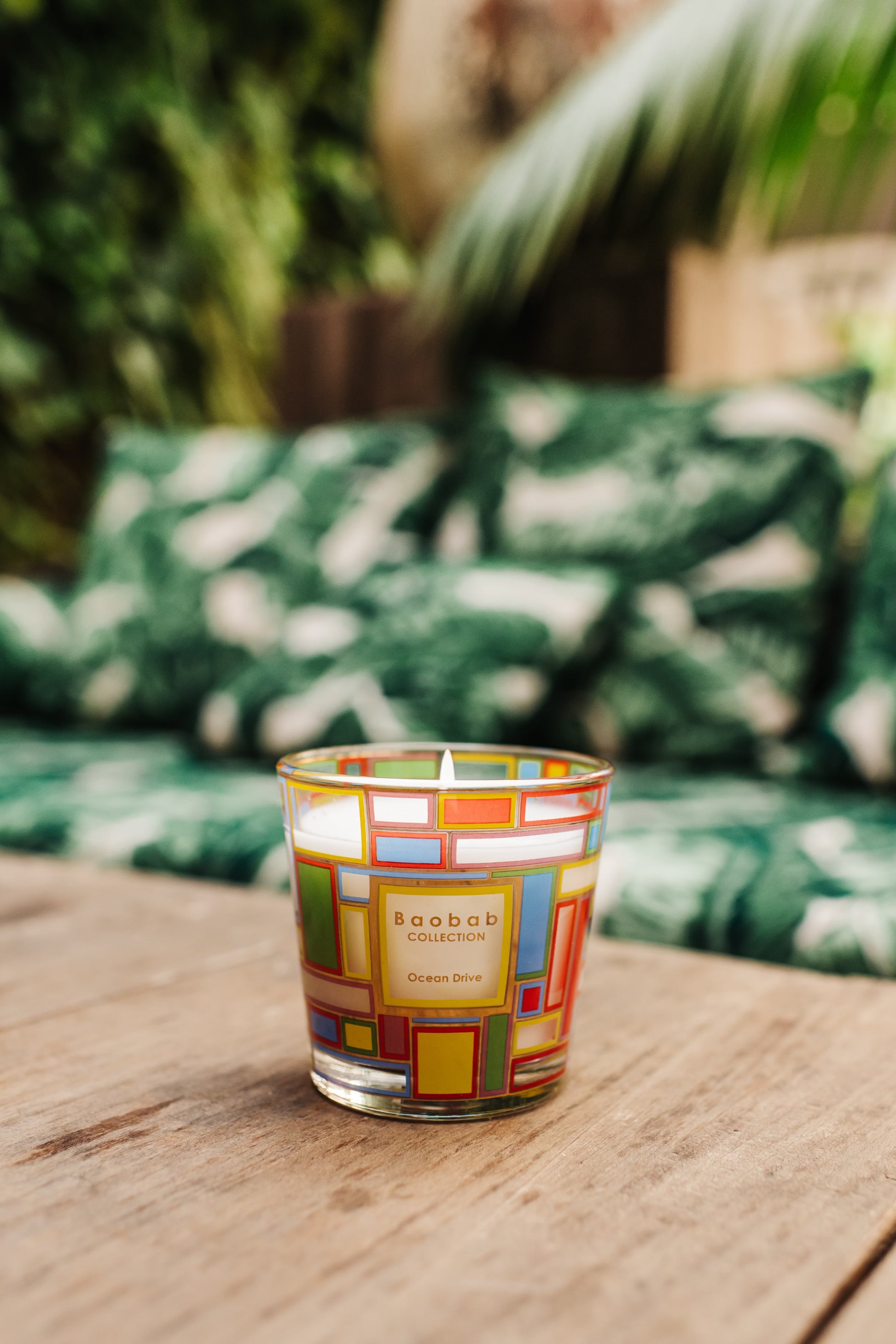 The Ocean Drive scented candle has an artistic design inspired by Peter Halley. Its abstract pattern of neon colors captures the energy of Ocean Drive's windows. Its fragrance of mandarin and cedar will take you to the city's vibrant atmosphere.