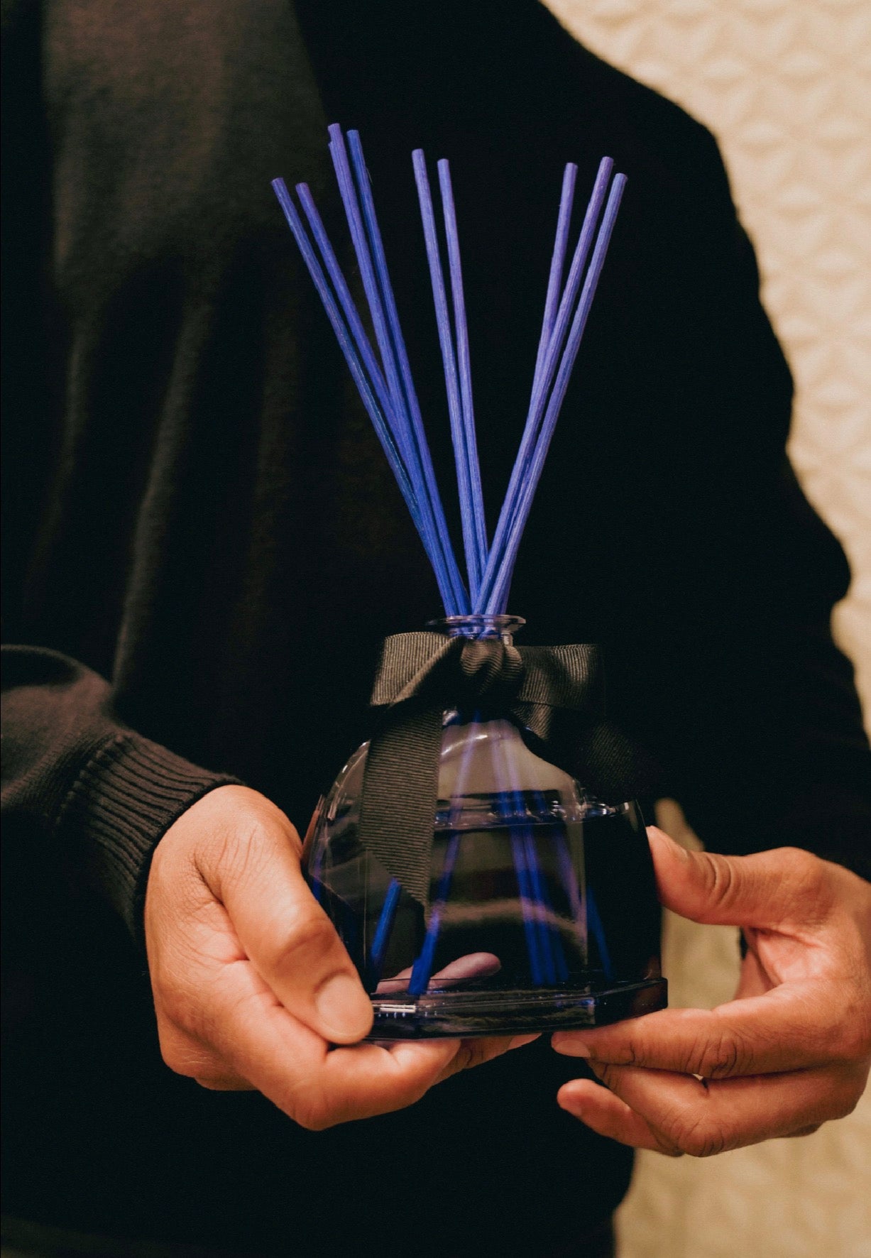After removing the glass stopper, insert the provided blue reeds and spread them open. Allow 24 hours for the fragrance to disperse through the reeds and into the surrounding environment. Flip reeds occasionally to refresh.